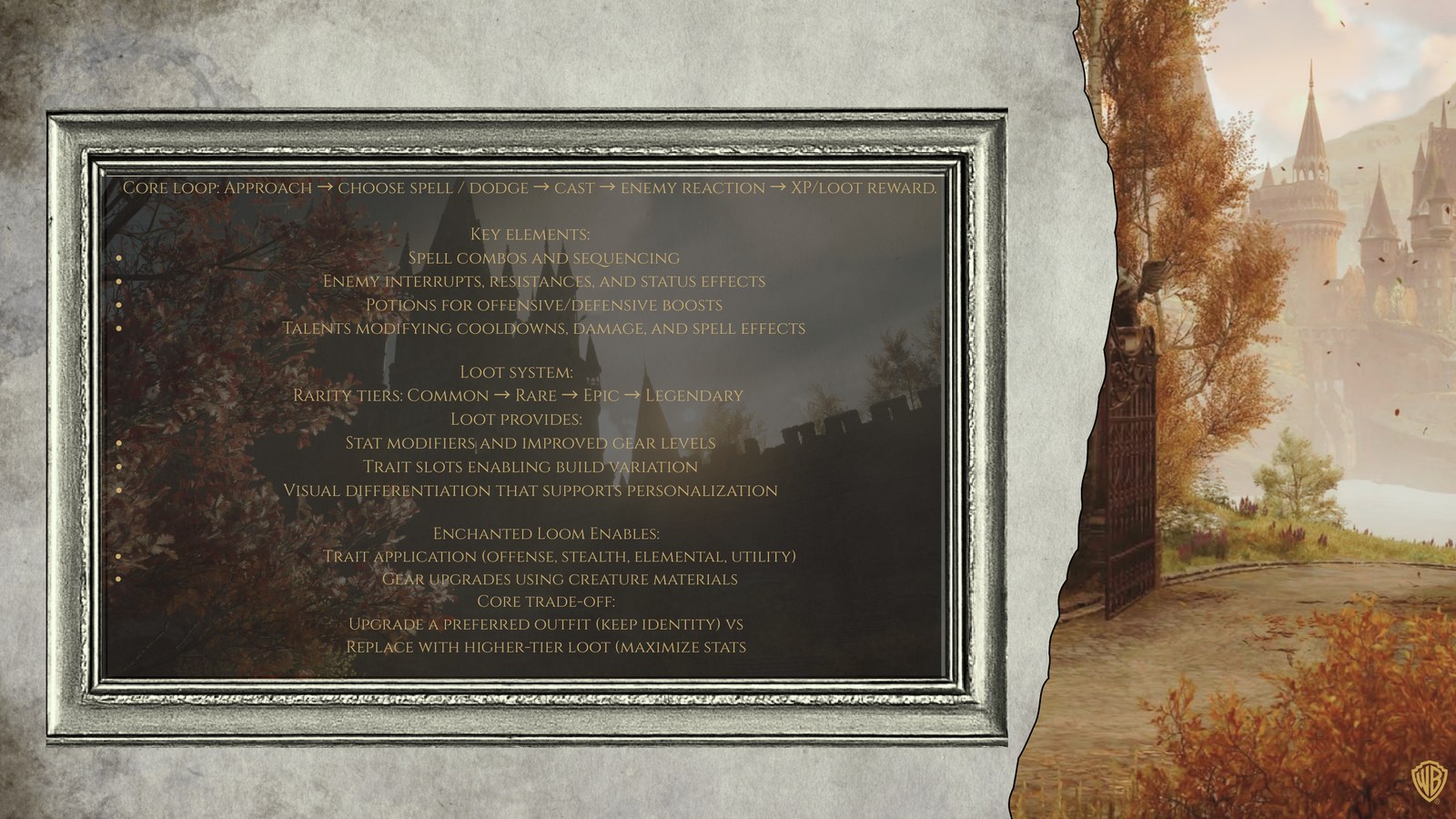 Progression & pacing : sources d’XP, level cap ~40, pics de puissance via talents, early/mid/late game. Systèmes de jeu : core loop combat (spell combos, dodge), loot (rarities, traits), Enchanted Loom (application de traits), potions & crafting (Room of Requirement). Personas : profils de joueurs (déclencheurs d’achat, frustrations, comportements). Recommandations de monétisation : cosmétiques, packs décoratifs Room of Requirement, DLC narratif. Contraintes & risques : préserver l’intégrité du lore, refuser le pay-to-win / lootboxes / battle pass / seasonal grind. Roadmap & pricing : bundles thématiques de DLC, grilles d’évaluation/valeur des skins, proposition de cycles “waves” annuels. Mesure de performance : KPIs acquisition / rétention / monétisation (ex. conversion HC, attach rate bundles, etc.).